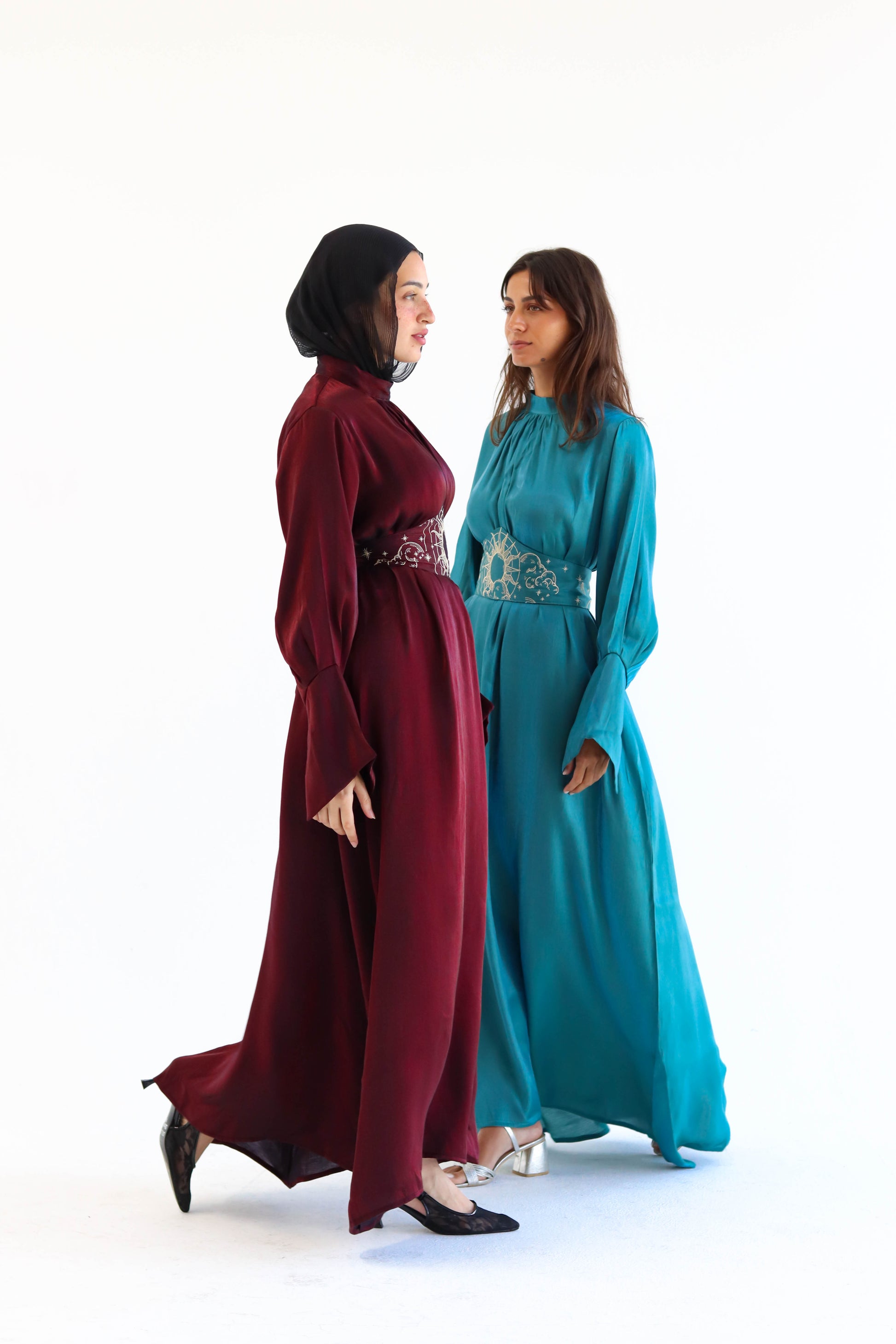 Step into a world of ethereal elegance with our luminous satin organza gown. This dress is crafted from a whisper-light fabric that combines the subtle sheen of satin with the airy drape of organza, creating a silhouette that flows and moves with liquid grace. The design features a sophisticated high, gathered neckline and dramatic bishop sleeves that gather at the wrist. While the dress itself is a vision of minimalist beauty, it is transformed by the exquisite, separate corset belt. The true centerpiece is the stunning, separate corset belt. Richly embroidered with a celestial pattern, this wide belt cinches the waist to create a dramatic and flattering silhouette, tying elegantly at the back. It fastens with long, delicate ties at the back for a perfect, adjustable fit.