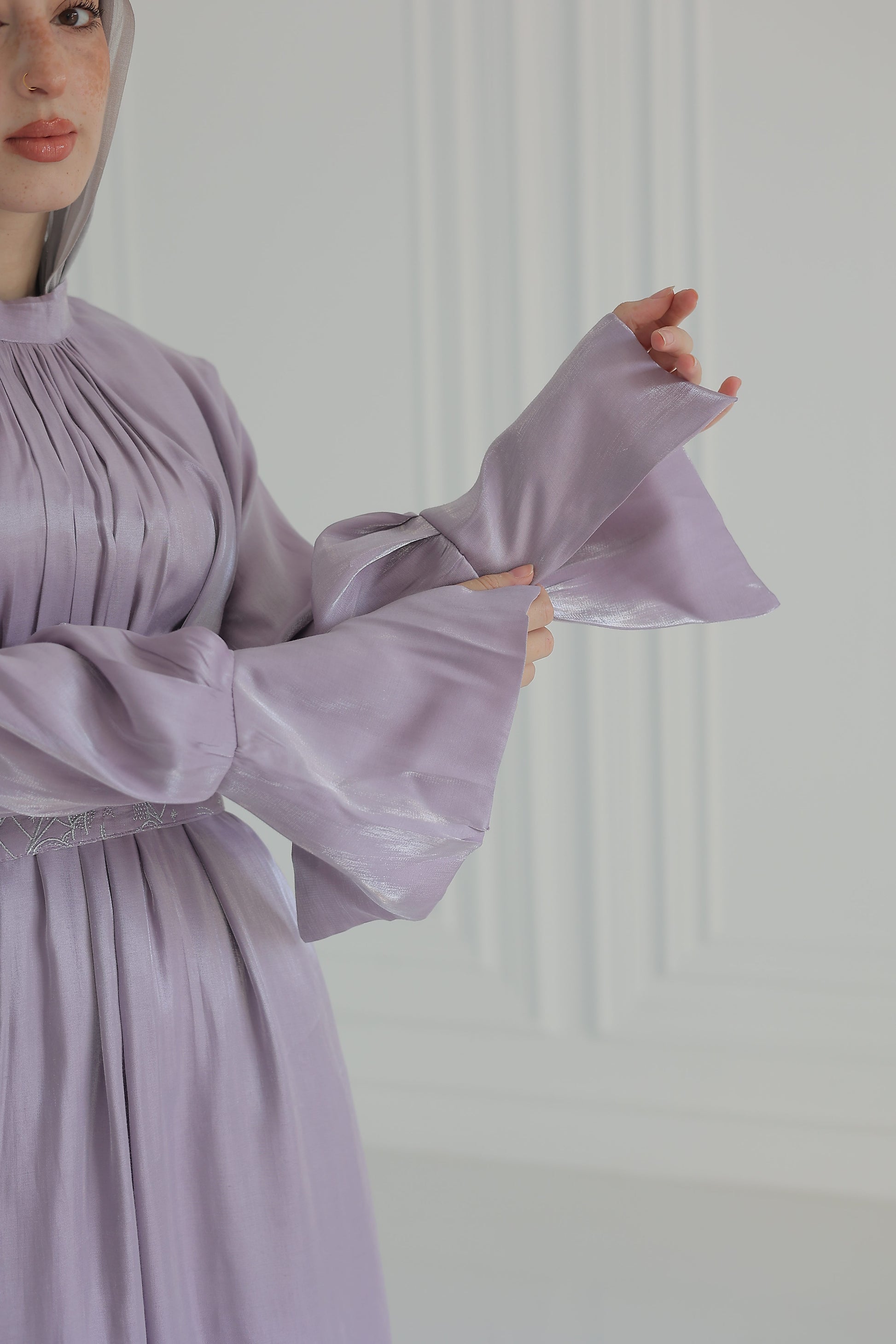 - Elegant high neckline and long bishop sleeves.