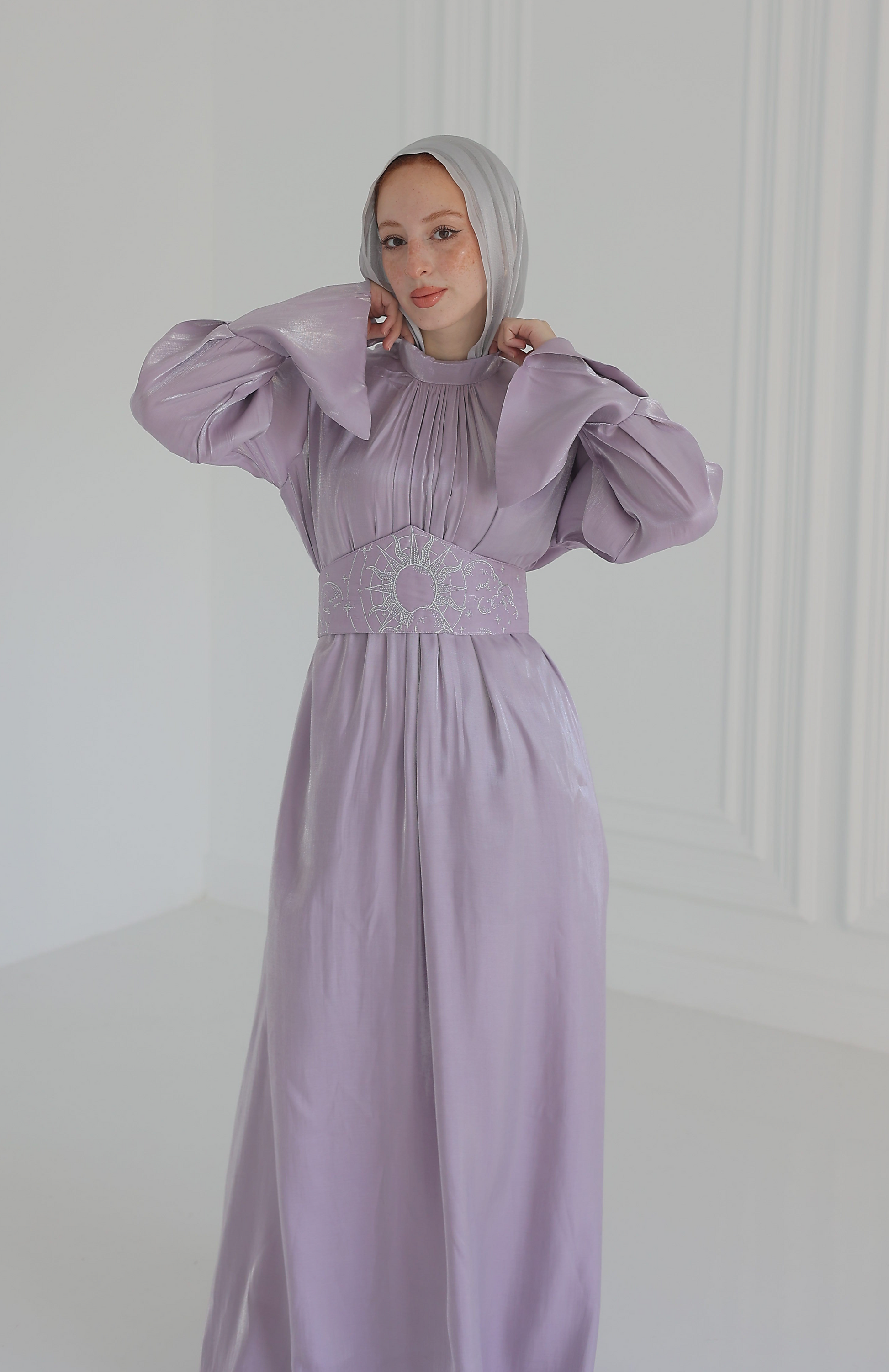 Step into a world of ethereal elegance with our luminous satin organza gown. This dress is crafted from a whisper-light fabric that combines the subtle sheen of satin with the airy drape of organza, creating a silhouette that flows and moves with liquid grace. The design features a sophisticated high, gathered neckline and dramatic bishop sleeves that gather at the wrist. While the dress itself is a vision of minimalist beauty, it is transformed by the exquisite, separate corset belt. The true centerpiece is the stunning, separate corset belt. Richly embroidered with a celestial pattern, this wide belt cinches the waist to create a dramatic and flattering silhouette, tying elegantly at the back. It fastens with long, delicate ties at the back for a perfect, adjustable fit.