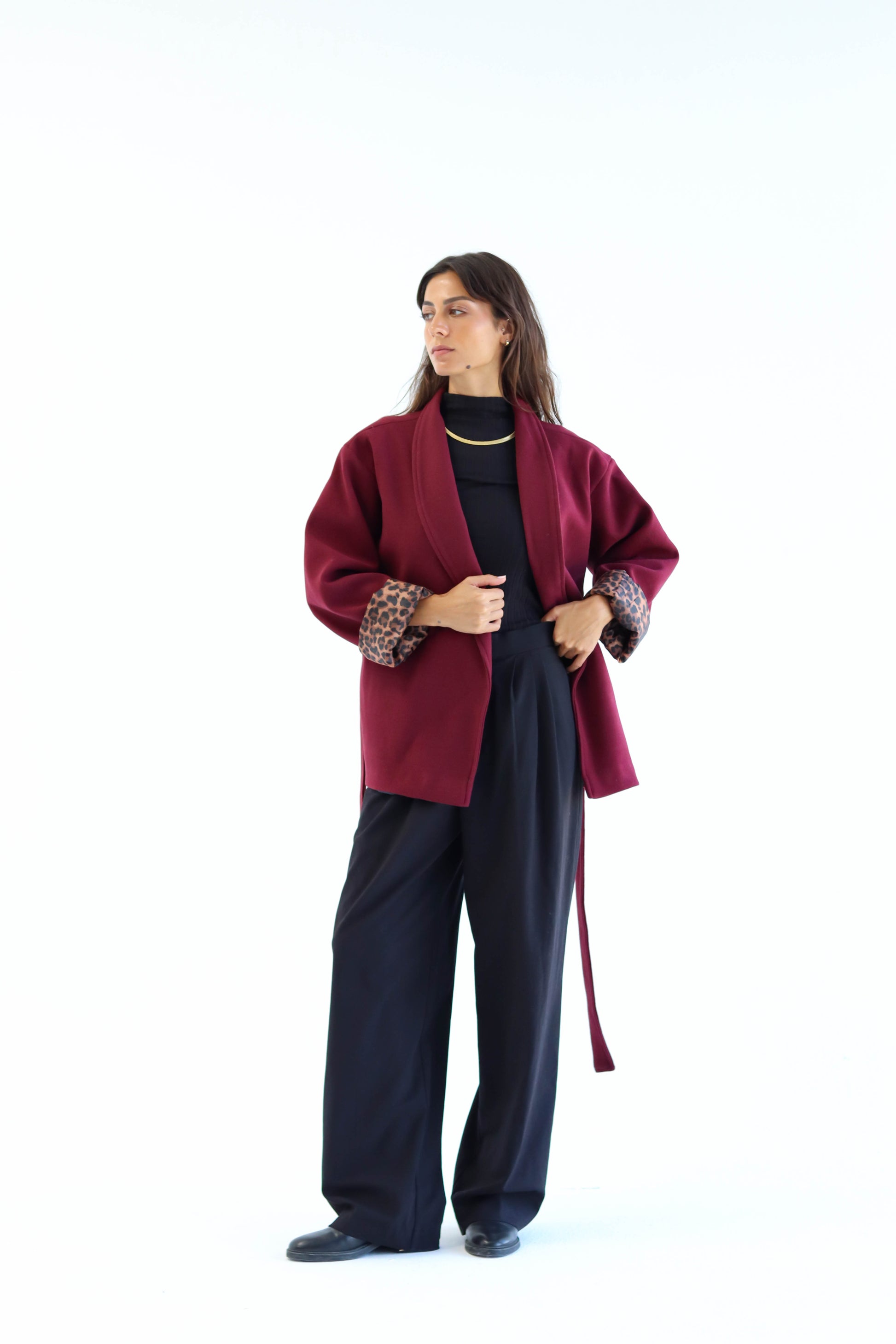 Discover the perfect blend of classic elegance and contemporary flair with our stunning wrap coat. Crafted from a luxurious and warm wool-blend fabric, this coat drapes beautifully for an effortlessly chic look. The self-tie belt allows you to cinch the waist for a defined and flattering silhouette, while the bold leopard print lining in the cuffs adds a touch of playful sophistication. Perfect for both casual outings and more formal events, this coat is a versatile must-have for the season.
