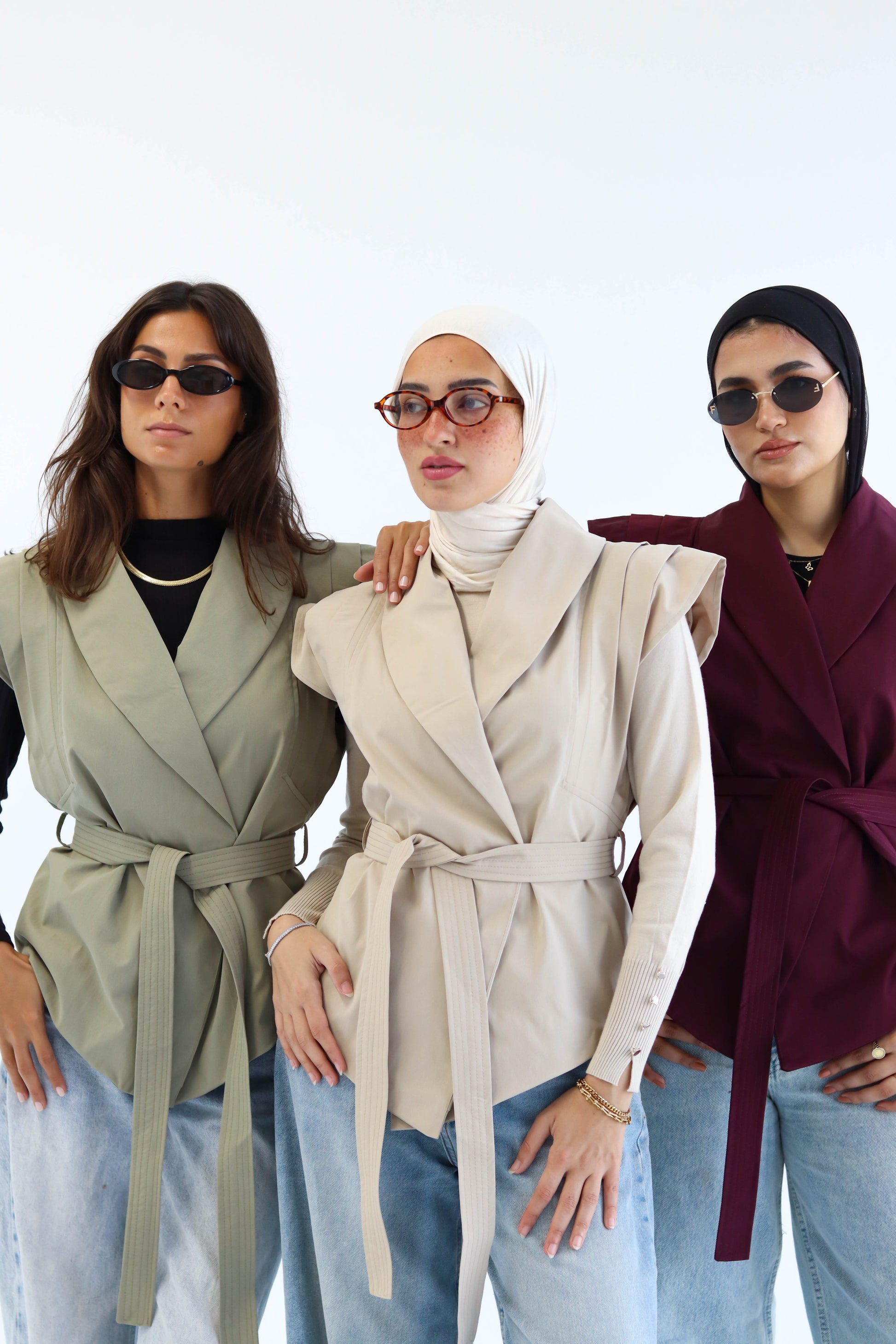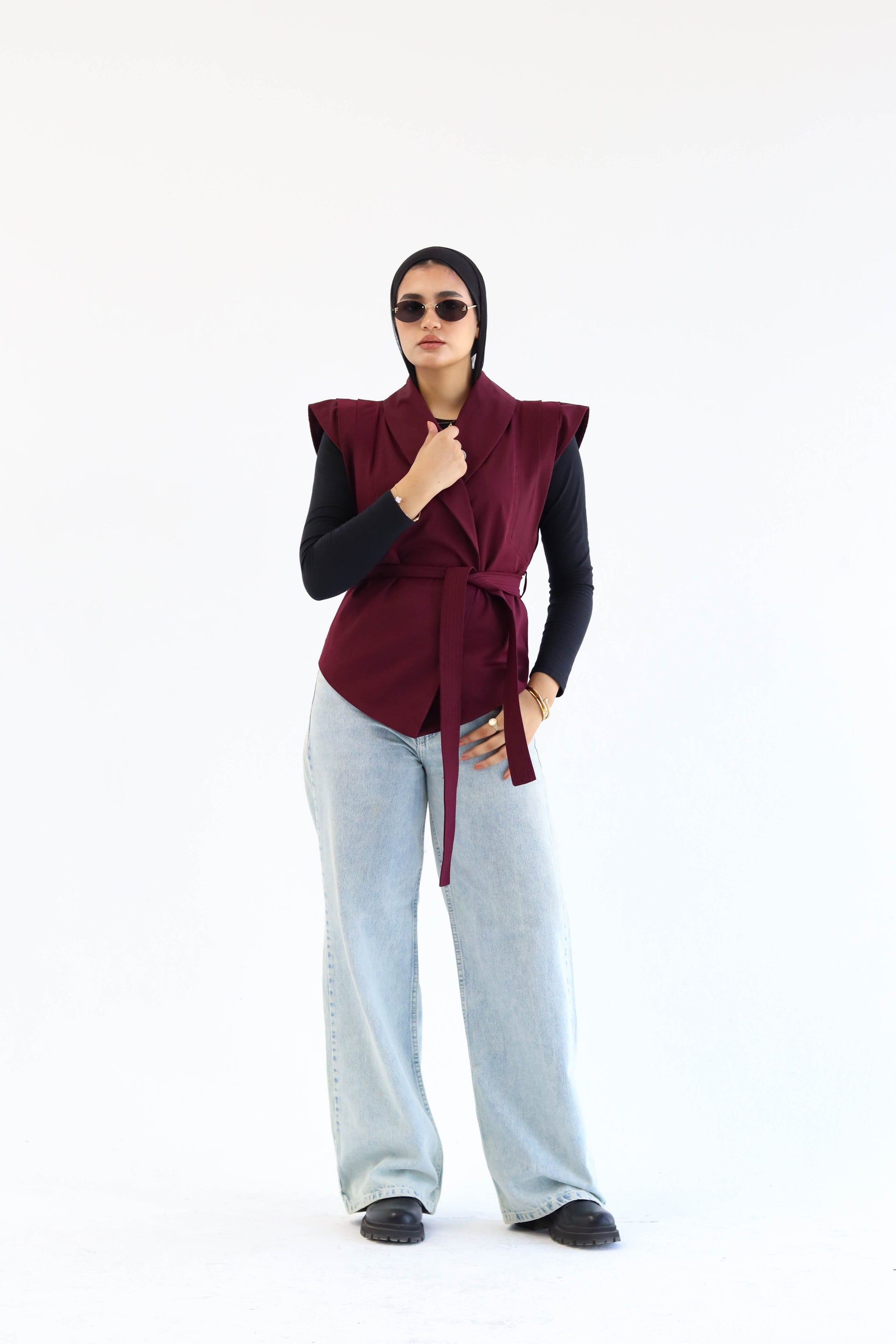 Introducing the ultimate layering piece for the modern wardrobe: our sophisticated gabardine vest. Expertly tailored from high-quality, smooth gabardine fabric, this vest offers a structured yet comfortable fit. The design features a chic wrap front with a wide shawl collar, creating an elegant, elongated silhouette. The distinctive, padded shoulders add a contemporary, powerful touch. Cinch your waist to perfection with the matching belt, which is beautifully accented with detailed, parallel stitches for a refined finish. This versatile vest is perfect for elevating a simple turtleneck and jeans or for adding a polished layer to your office attire.