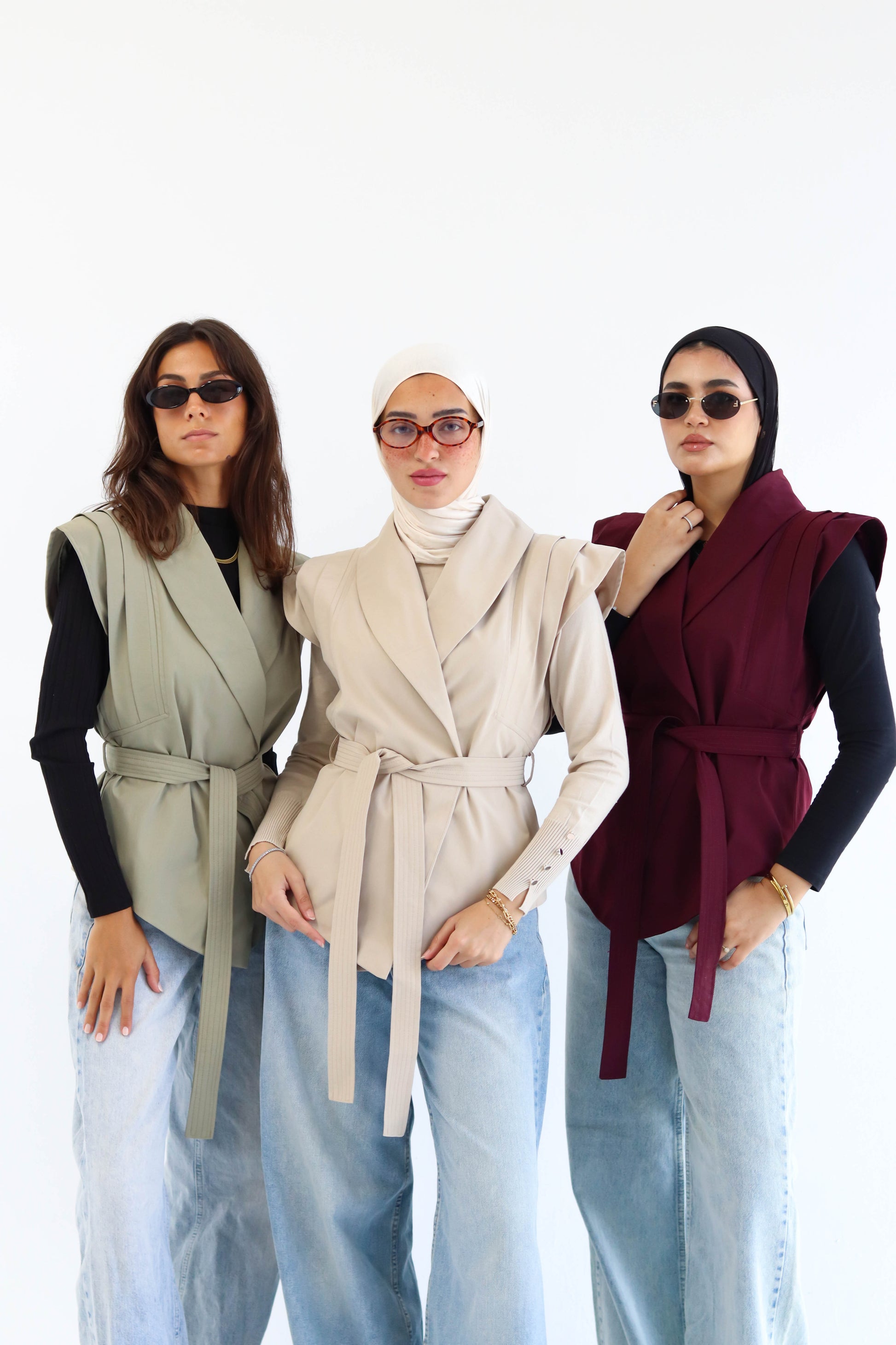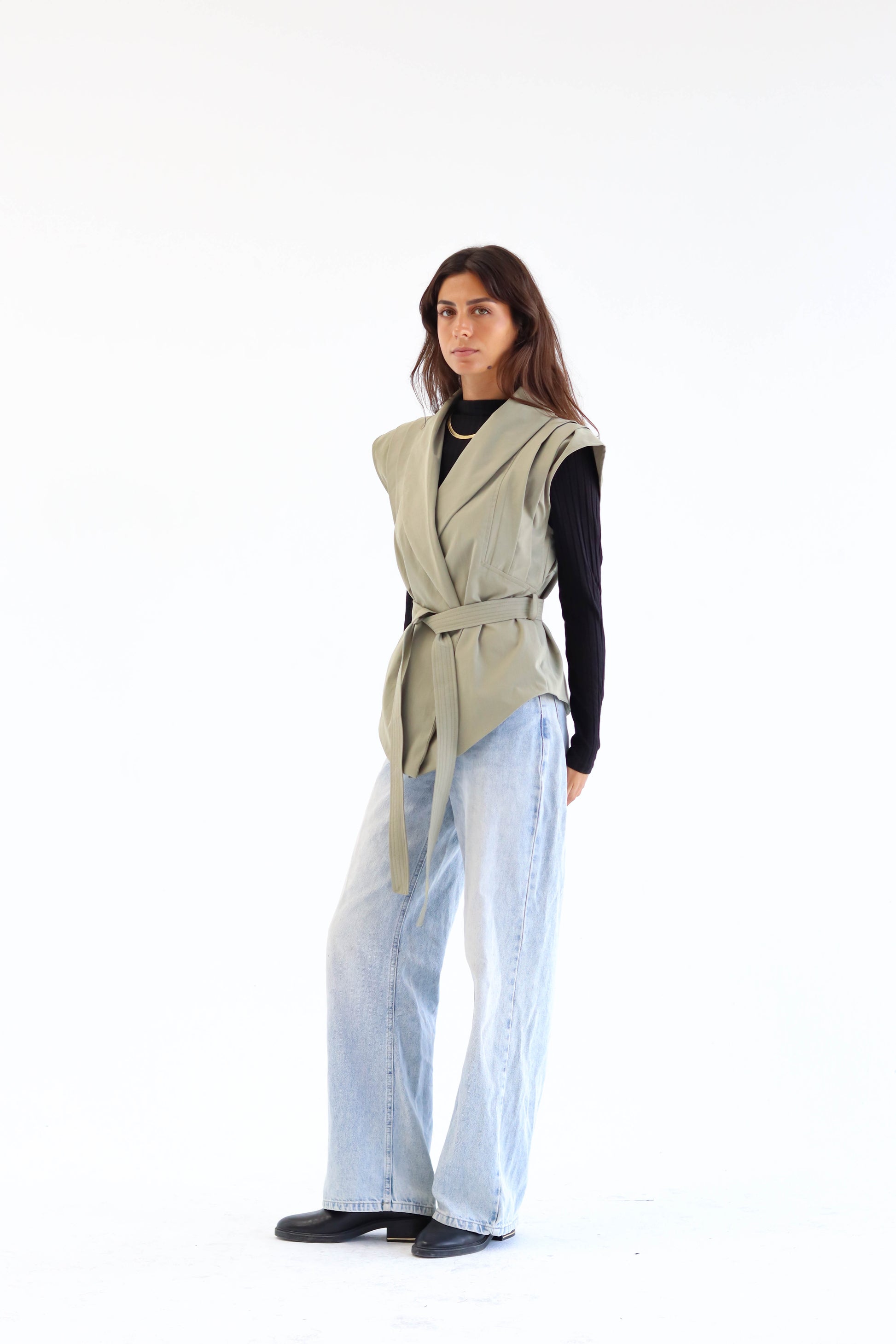 Introducing the ultimate layering piece for the modern wardrobe: our sophisticated gabardine vest. Expertly tailored from high-quality, smooth gabardine fabric, this vest offers a structured yet comfortable fit. The design features a chic wrap front with a wide shawl collar, creating an elegant, elongated silhouette. The distinctive, padded shoulders add a contemporary, powerful touch. Cinch your waist to perfection with the matching belt, which is beautifully accented with detailed, parallel stitches for a refined finish. This versatile vest is perfect for elevating a simple turtleneck and jeans or for adding a polished layer to your office attire.